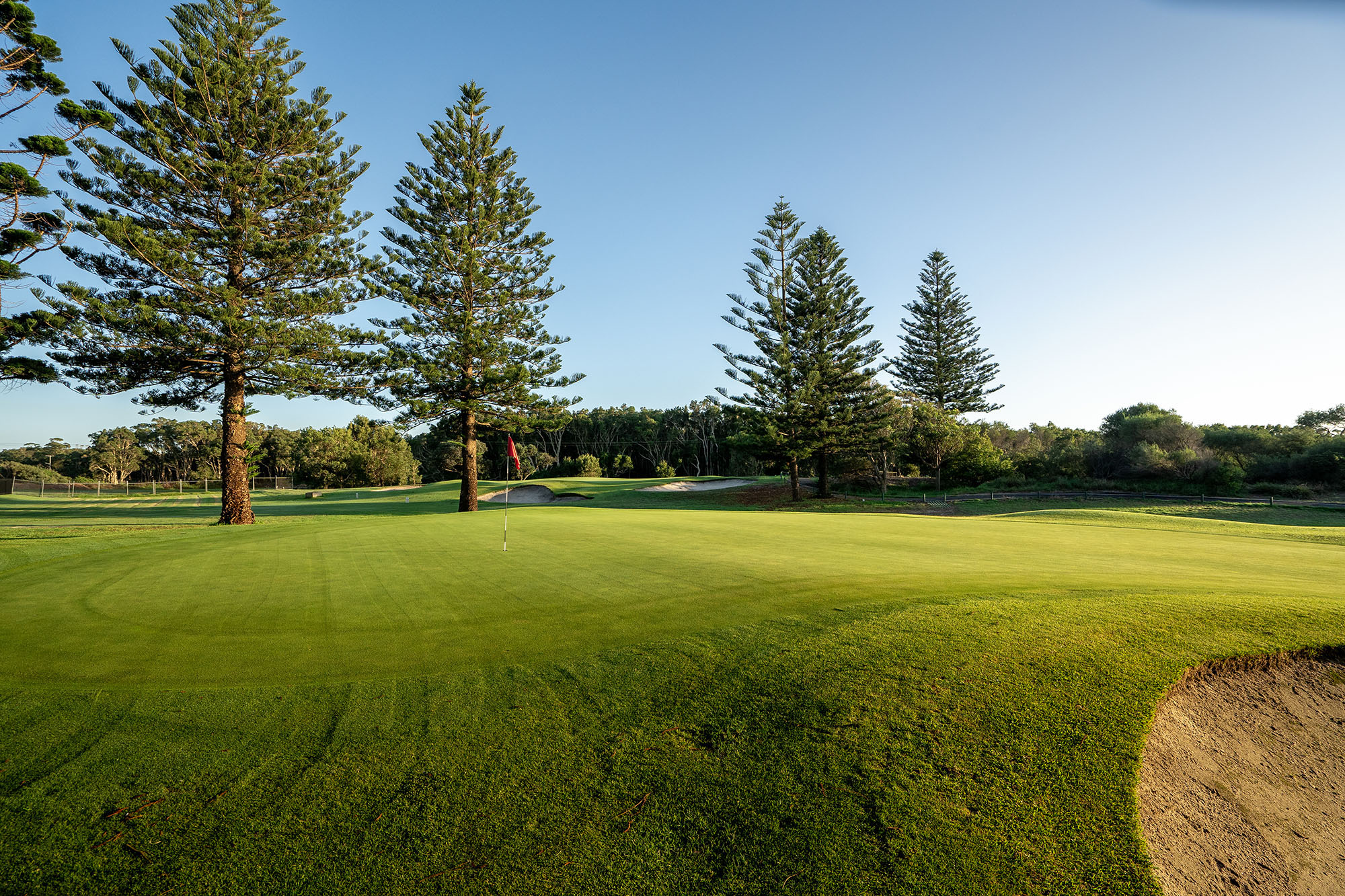Downhill par 4 moves slightly left to right. Ideal tee shot is aimed at the power stations in distance to avoid trees on the right. Difficult split-level green is heavily guarded by bunkers on both sides.